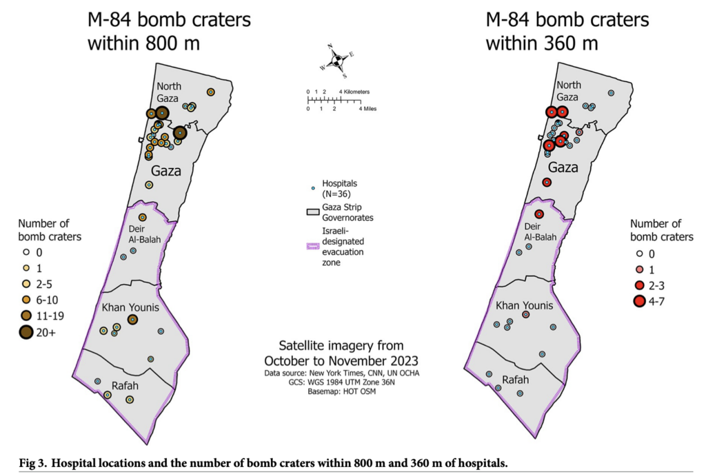 Este patrón de lesiones traumáticas no puede interpretarse aisladamente de la destrucción sistemática del propio sistema sanitario. Un análisis geoespacial publicado en PLOS Global Public Health documentó -entre octubre y noviembre de 2023, cuando todavía estábamos lejos de los niveles actuales de destrucción de infraestructuras- que el 83% de los hospitales de Gaza se encontraban dentro del radio de daño (800 m) y el 25% dentro del radio letal (360 m) de las detonaciones de bombas de alta potencia (2.000 lb), en algunos casos con distancias mínimas de apenas 15 m respecto a las instalaciones hospitalarias.